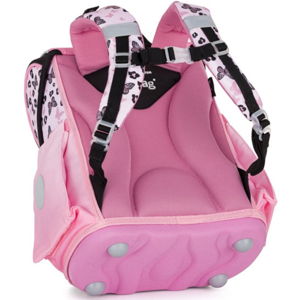 Dno batohu je z pevného materiálu, chrání tím obsah před převržením a vysypáním. Zapínání je na bezpečnostní kovovou přezku s reflexní odrazkou.