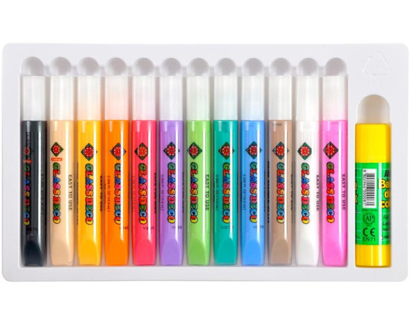 - 9ks barev na sklo 10,5ml (žlutá, oranžová, růžová, fialová, tmavě zelená, světle zelená, modrá, hnědá, bílá)