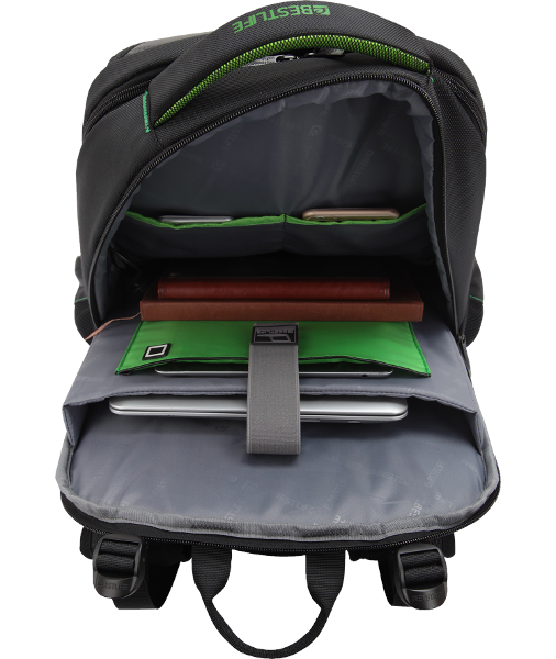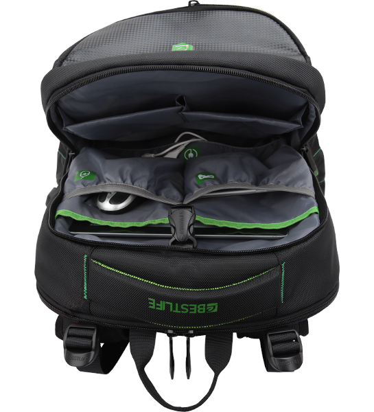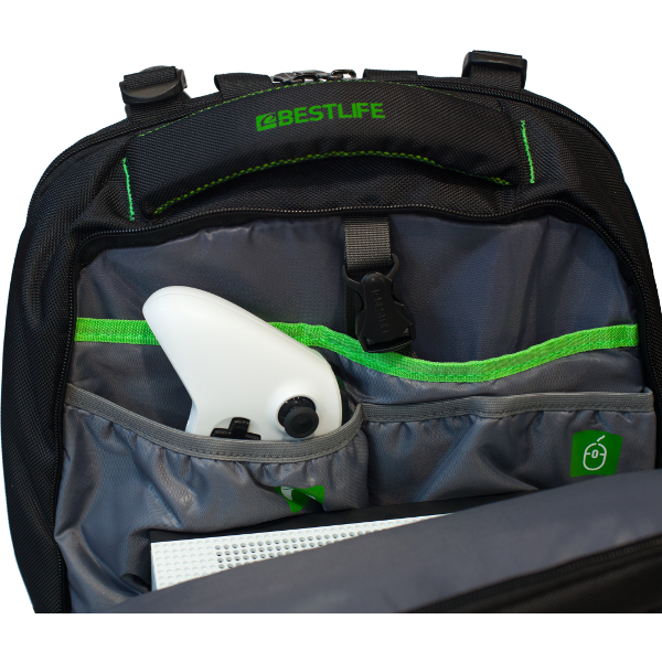 Funkční přihrádky pro myš, klávesnici, kabel, 3 velké přihrádky pro notebook, herní konzole a kapsa na tablet.