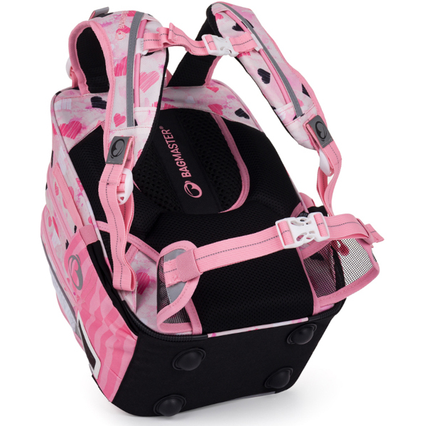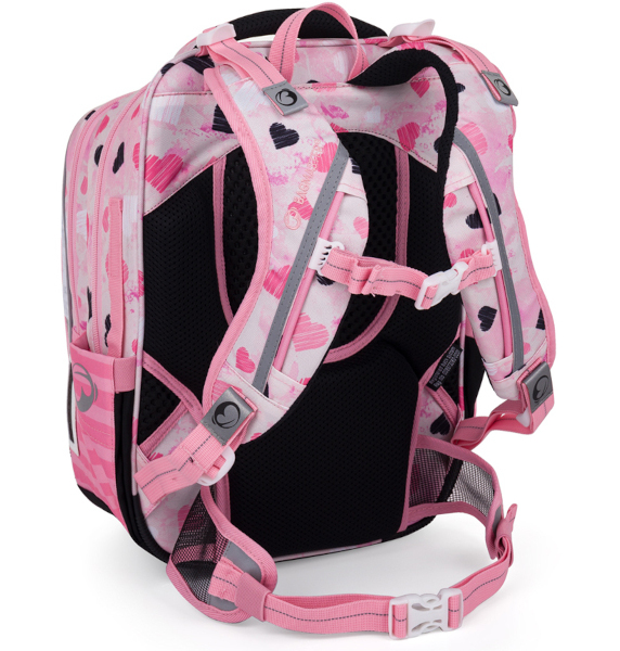 Ramenní popruhy i zádový systém jsou měkce polstrované. Popruhy se nastavují pomocí horních a dolních plastových spon. Je třeba upravovat délku podle toho, jak školačka roste. Konce popruhů jsou magnetické. Aby neblincaly, jednoduše je magnetem připnete nad plastovou sponu.