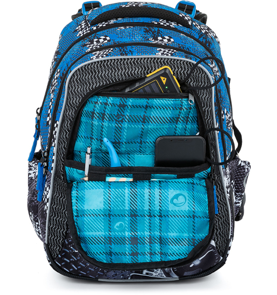Má tři prostorné komory. Do hlavní se vejdou velké školní desky i učebnice a sešity formátu A4.