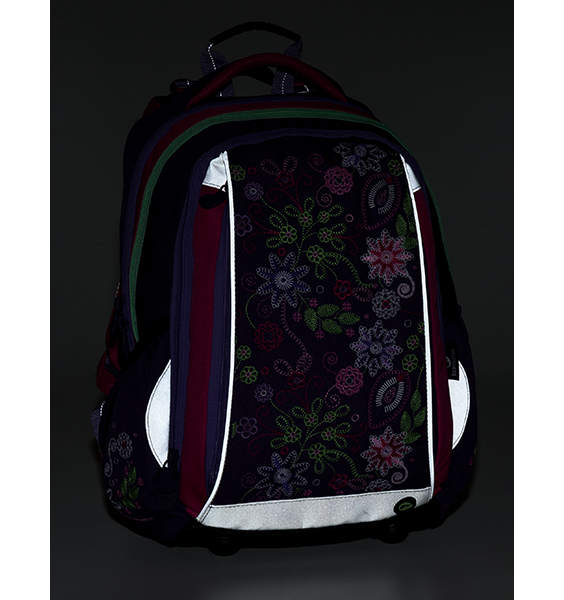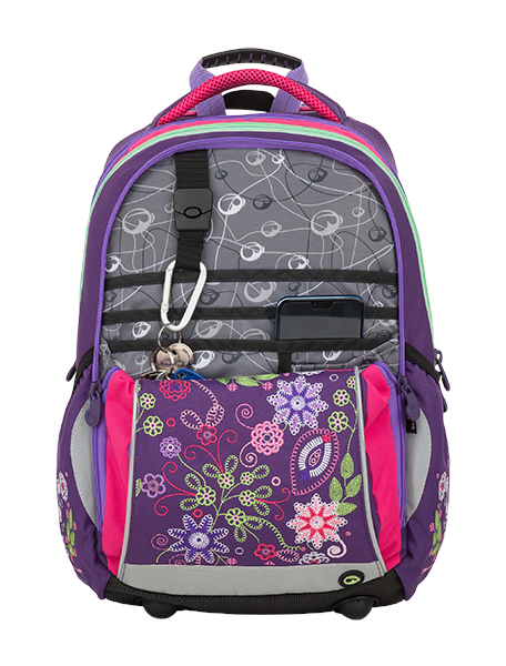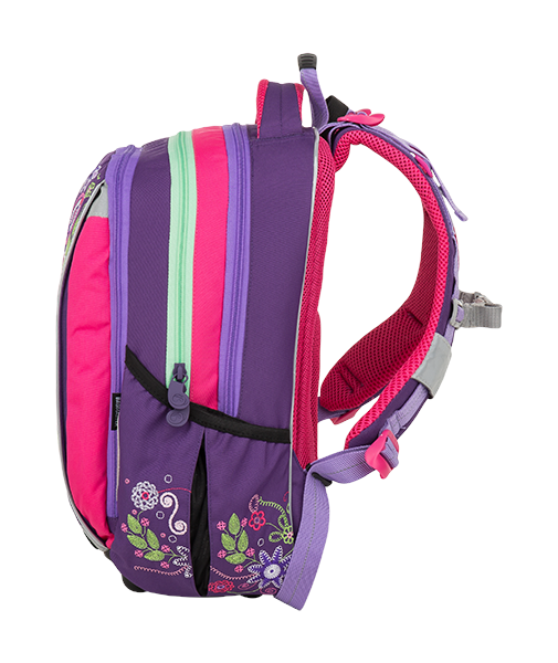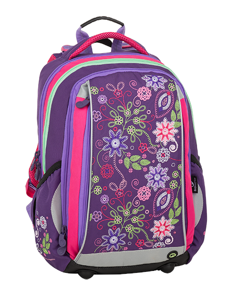 1.-3. třída ZŠ. Tříkomorový dívčí školní batoh pro prvňáčky s motivem kytky.