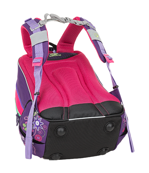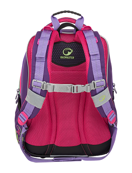 Anatomicky tvarovaná záda, včetně lehkého hliníkového rámu pro rovnoměrné rozložení zátěže školních pomůcek.