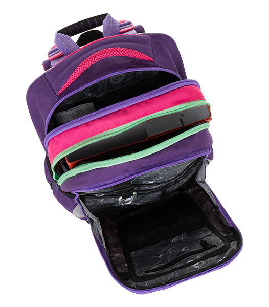 Tříkomorový školní batoh s přední kapsou na zip (skrytá).
