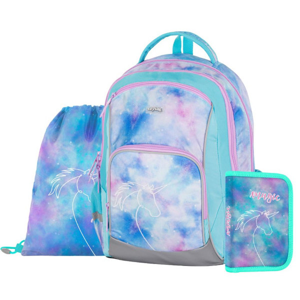 Penál: Jednopatrový se dvěma chlopněmi, poutka na psací potřeby a průhledná fólie na rozvrh hodin.- Výrobce:Oxybag