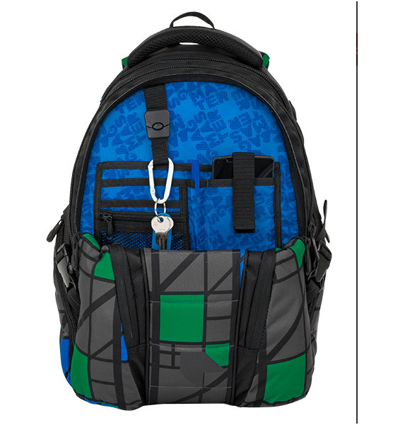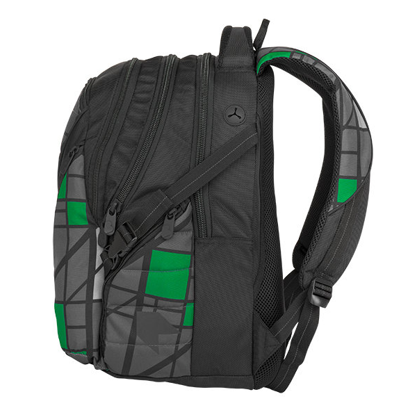 Studentský batoh, vhodný od 4. třídy ZŠ. Tříkomorový, prostorný. Polstrovaná záda a ramenní popruhy. Dvě boční kapsy na láhev. Organizér, odnímatelný klip na klíče. Reflexní prvky. Polstrovaná kapsa na notebook 15".