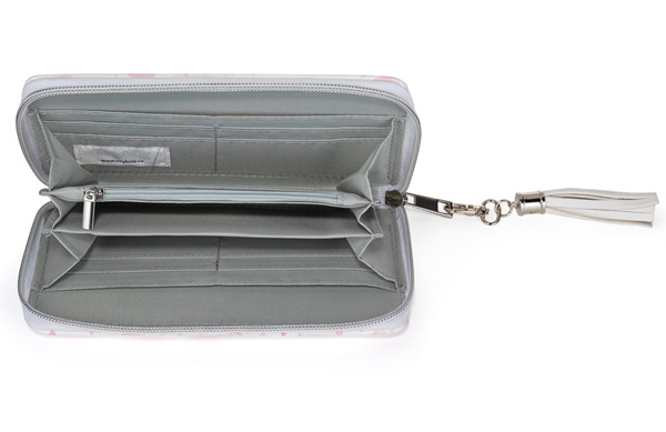 Uvnitř je 8 menších kapes na věrnostní karty, 2 větší kapsy, 3 oddělené přihrádky na hotovost a 1 uzavíratelná kapsa na zip na drobné mince.