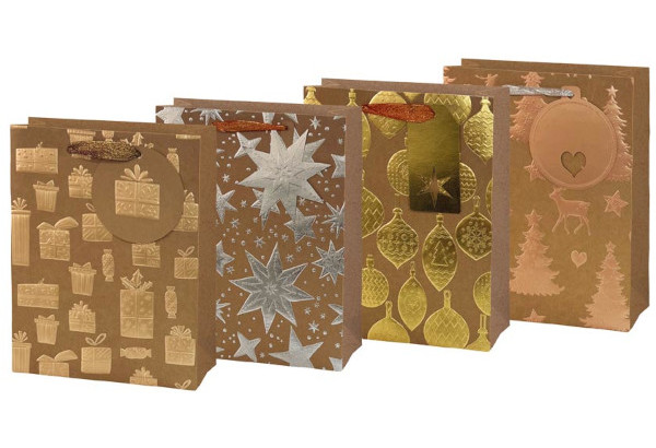 Vánoční papírová dárková taška L LUX KRAF s vánočními motivy je skvělou volbou pro každého, kdo hledá stylový a praktický způsob balení dárků. Je vyrobena z pevného kraftového papíru, který zaručuje nejen vysokou odolnost, ale také atraktivní vzhled. Taška je vybavena textilními uchy pro pohodlné přenášení a obsahuje kartičku, na kterou můžete napsat jméno obdarovaného nebo krátké přání.