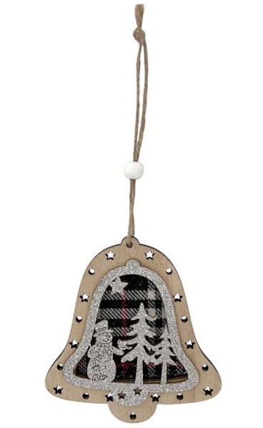 Dekorace dřevěná závěs zvoneček se sněhulákem.