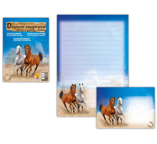 Na dopisním papíře i na obálce najdete obrázek s koňmi. Dopisní papír je opatřený linkami. Baleno v plastovém sáčku se závěsem.