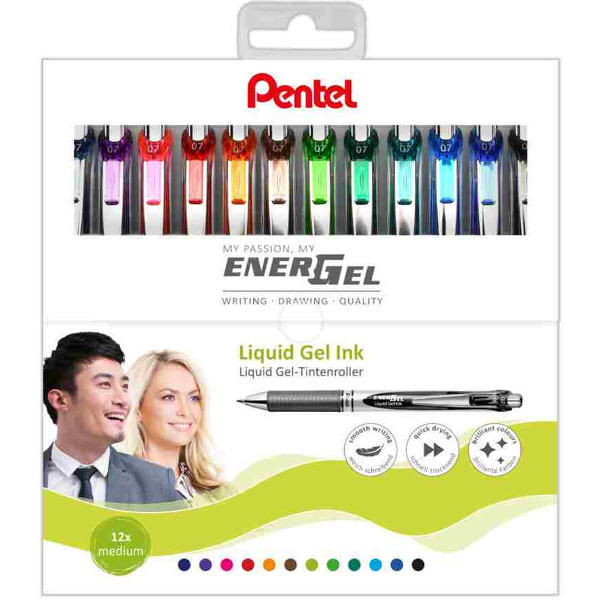 vyměnitelná náplň • barva náplně odpovídá barvě těla • rychleschnoucí inkoust • vhodné i pro leváky • průměr hrotu 0,7 mm • šíře stopy 0,5 mm • elegantní moderní design • pogumovaná úchopová část pro pohodlné psaní • kovový klip • stiskací mechanismus • stříbrné tělo • sada 12 ks