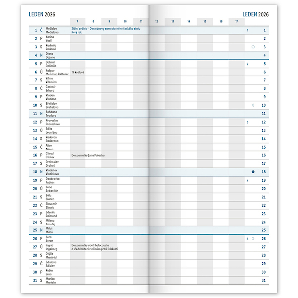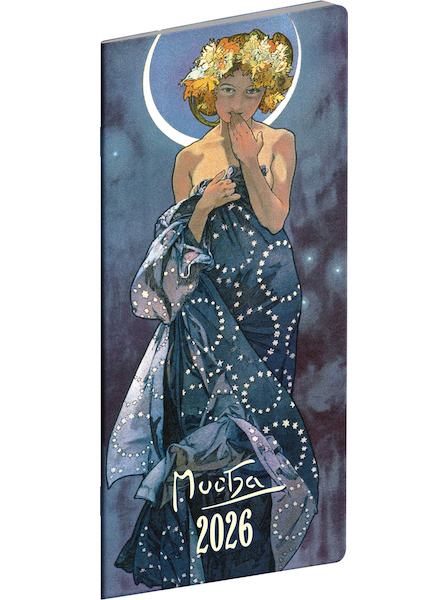 praktický tenký diář s motivem obrazů Alfonse Muchy s měsíčním rozložením se vejde opravdu všude • obsahuje české kalendárium se jmény, svátky a památnými dny, pracovní kalendář, seznam jmen a přehled na rok 2026 a 2027 • rozměr: 8 x 18 cm • PGD-MESPL-35780