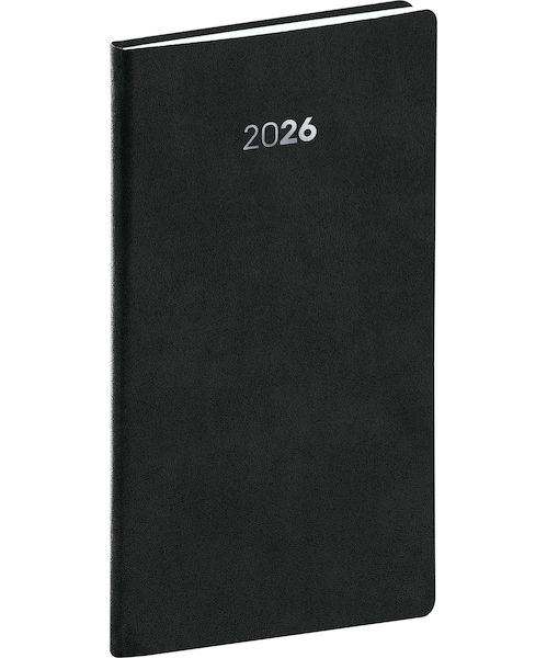 Plánovací kapesní diář Balakon 2026 v černém provedení, doplněný o stříbrný letopočet. Povrch diáře si získal oblibu díky kvalitnímu svrchnímu materiálu, který je extrémně odolný vůči vnějšímu poškození. Týdenní rozvrh s česko-slovenským kalendáriem a doplňkovou angličtinou, němčinou, maďarštinou a ruštinou.