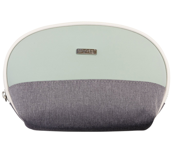 Cestovní kulatá kosmetická taška v šedozeleném provedení.