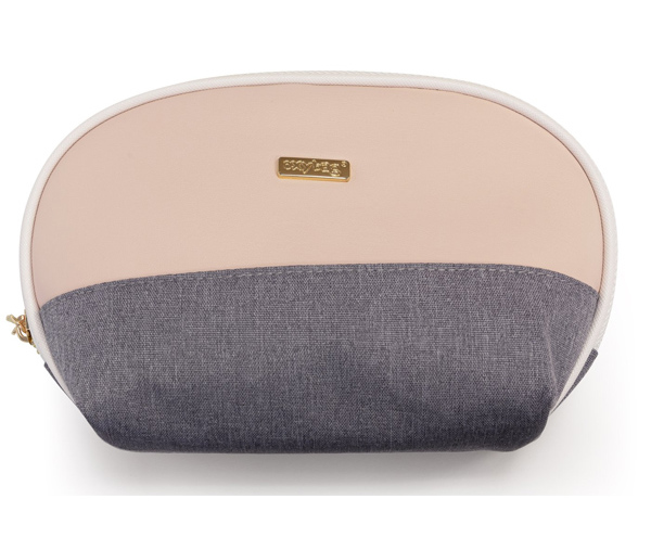 Cestovní kulatá kosmetická taška v šedorůžovém provedení.