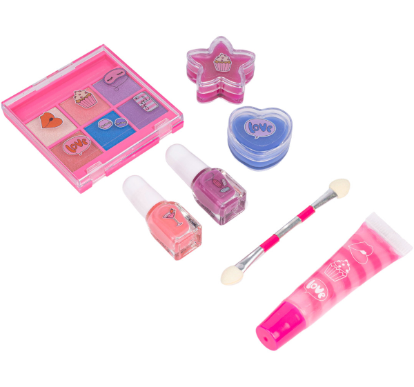 Sada obsahuje vše potřebné pro kompletní líčení: 2 laky na nehty (světle růžový a světle modrý), 2 balzámy na rty, lesk na rty, 6 barev očních stínů a praktický štětec.