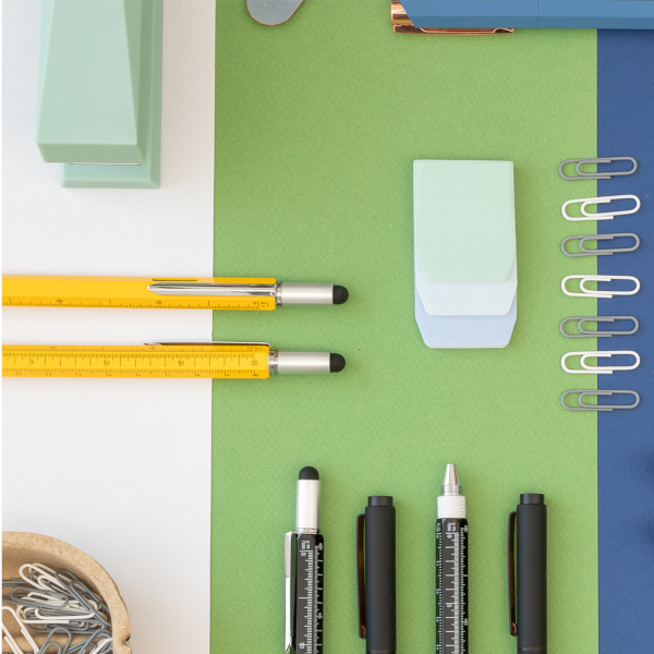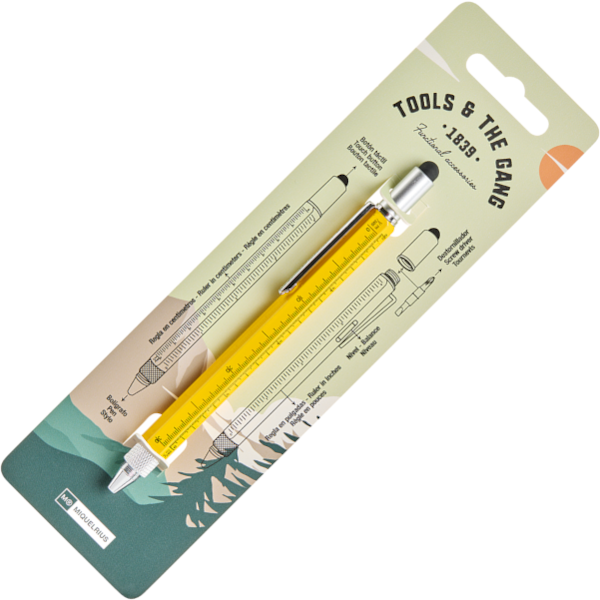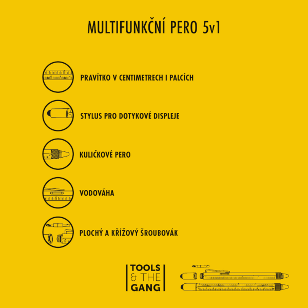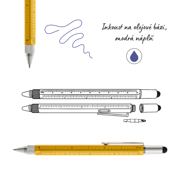 Kromě kuličkového pera obsahuje pravítko v centimetrech i palcích, vodováhu, plochý a křížový šroubovák a dotykový stylus pro smartphony a tablety.