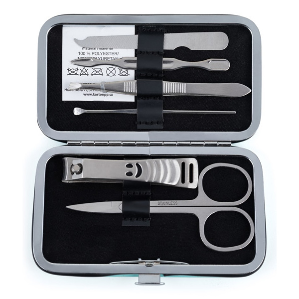 Stříbrná sada obsahuje nůžky, kleštičky na nehty, zkosenou pinzetu, pilník, manikúrní tyčinku a zatlačovač kůžičky.