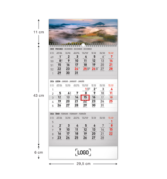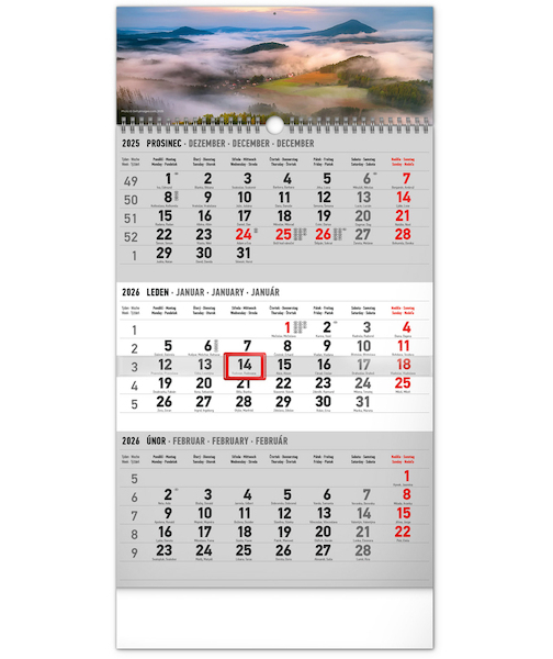 Nástěnný kalendář 3měsíční Krajina šedý – s českými jmén 29,5×43cm