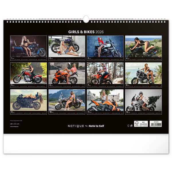 kalendář pro milovníky žen a silných strojů • dvanáct lechtivých fotografií krásných dívek pózujících s nablýskanými motocykly na stránkách nástěnného kalendáře v šířkovém formátu • obsahuje univerzální kalendárium • rozměr: 48 × 33 cm • PGN-33599-L
