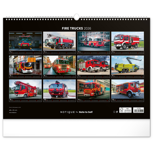 Nástěnný kalendář pro všechny příznivce hasičských vozů. Dvanáct snímků techniky hasičského záchranného sboru na stránkách kalendáře v šířkovém formátu. Fotografie jsou doplněny univerzálním kalendáriem na černém pozadí.
