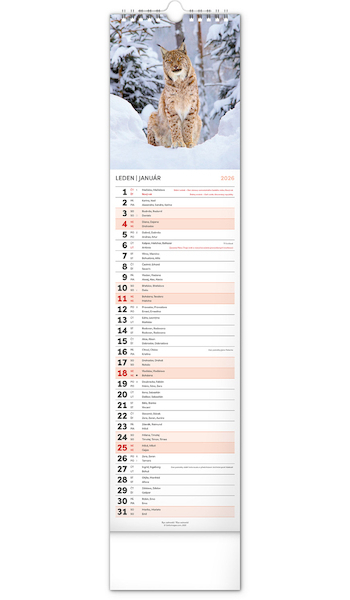Česko-slovenský nástěnný kalendář obsahuje dvanáct snímků zvířat z našich lesů. Je dvojjazyčný a najdete v něm jak česká, tak slovenská jména, svátky, památné dny i měsíční fáze.