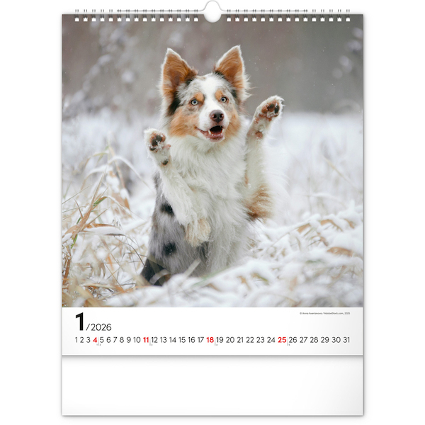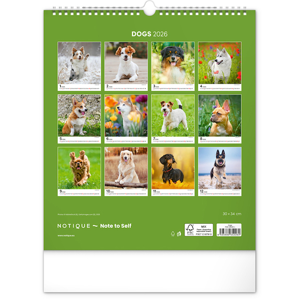 Snímky dvanácti psích plemen jsou v našem nástěnném kalendáři doplněny univerzálním kalendáriem na bílém pozadí.