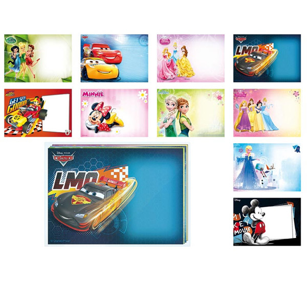 Dopisní obálky mají 10 různých potisků (Mickey Mouse, princezny, Nemo, Auta, Minnie Mouse, Frozen, Víly)