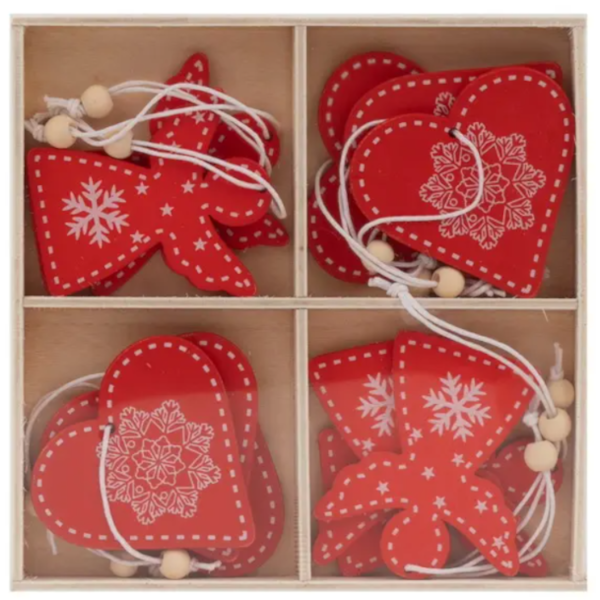 12 ks dřevěné dekorace v krabičce.
