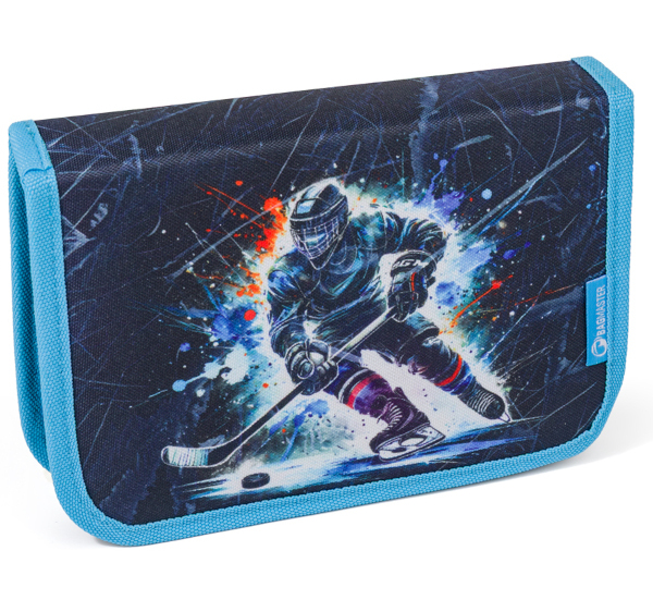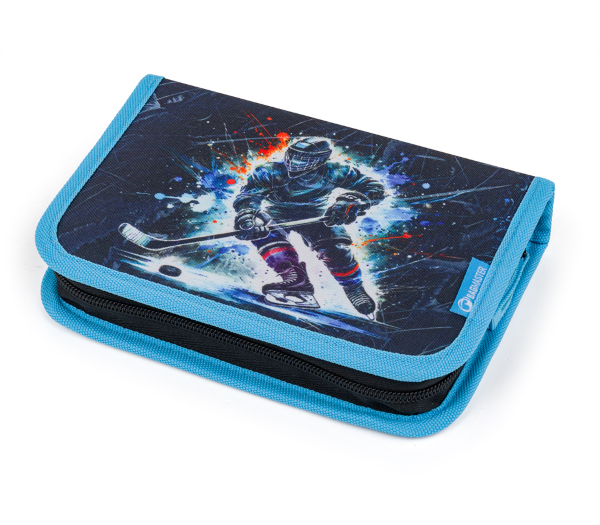 Školní penál. Díky dvěma chlopním nabízí dostatek prostoru i přehledné uspořádání všech školních pomůcek.