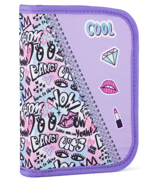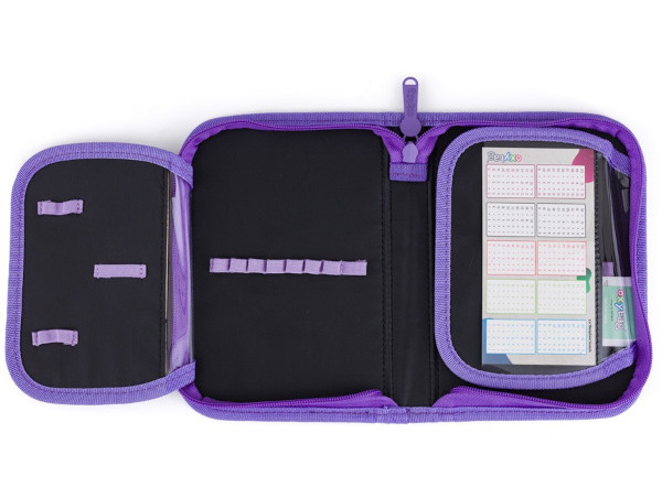 • Jednopatrový školní penál s 2 chlopněmi, prázdný obsahuje 25 gumových poutek pro uchycení psacích potřeb.