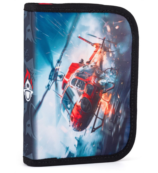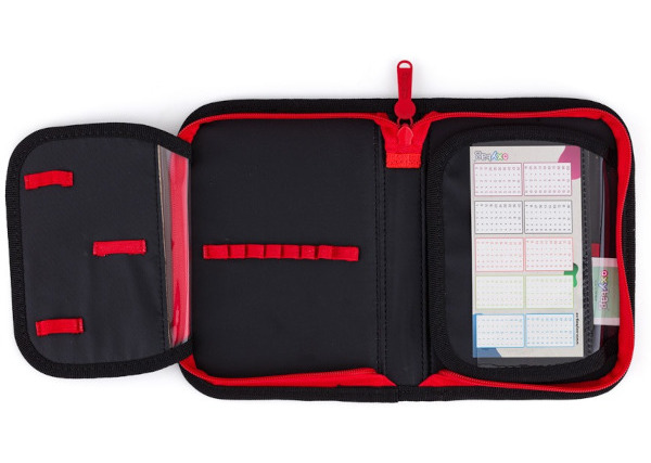 • Jednopatrový školní penál s 2 chlopněmi, prázdný obsahuje 25 gumových poutek pro uchycení psacích potřeb.
