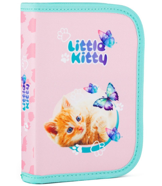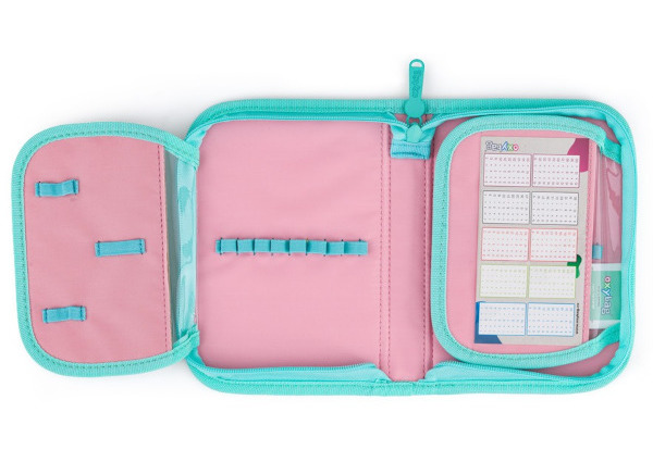 • Jednopatrový školní penál s 2 chlopněmi, prázdný obsahuje 25 gumových poutek pro uchycení psacích potřeb.