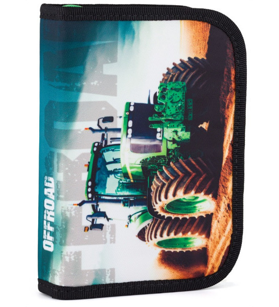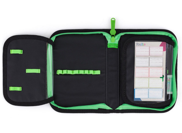 • Jednopatrový školní penál s 2 chlopněmi, prázdný obsahuje 25 gumových poutek pro uchycení psacích potřeb.