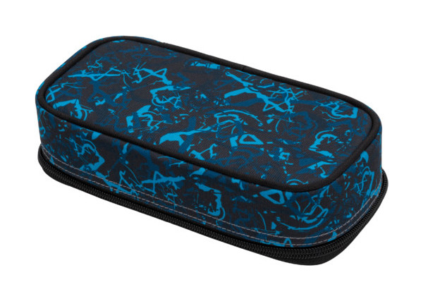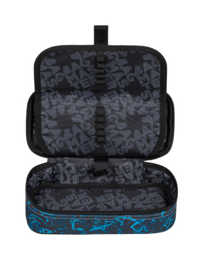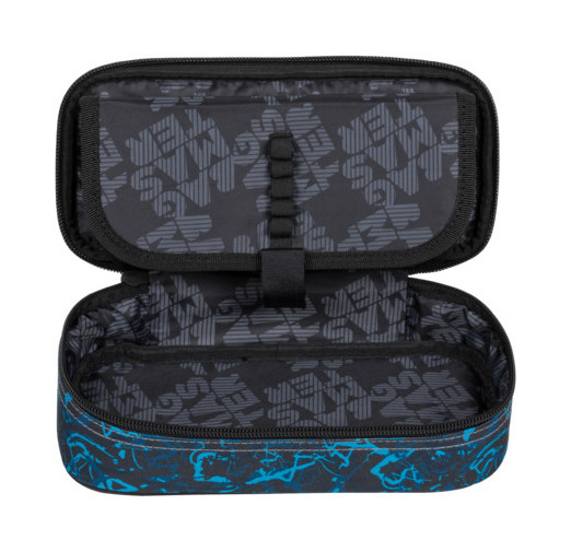 Jednokomorový studentský penál, dvojitá přepážka, spousta gumových úchytů, kapsičky uvnitř penálu.