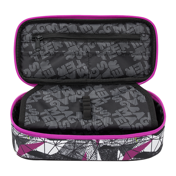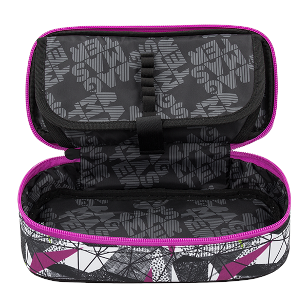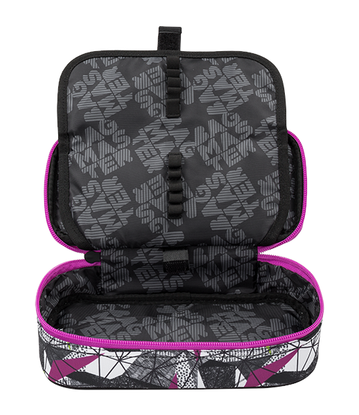 Jednokomorový studentský penál, dvojitá přepážka, spousta gumových úchytů, kapsičky uvnitř penálu.