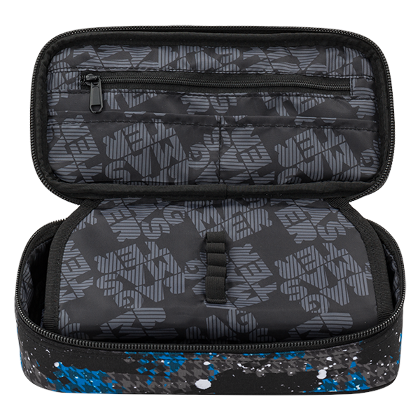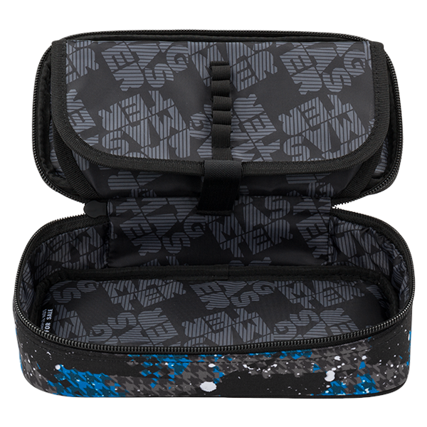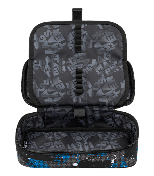 Jednokomorový studentský penál, dvojitá přepážka, spousta gumových úchytů, kapsičky uvnitř penálu.