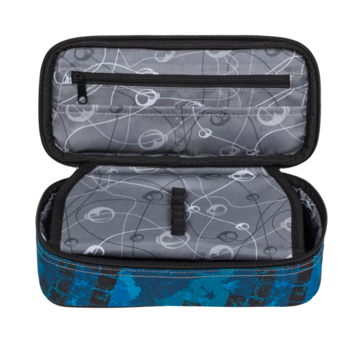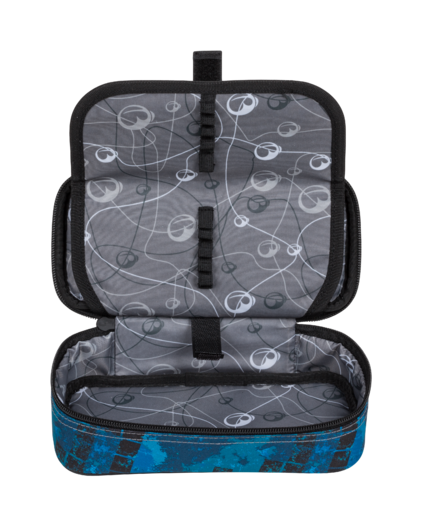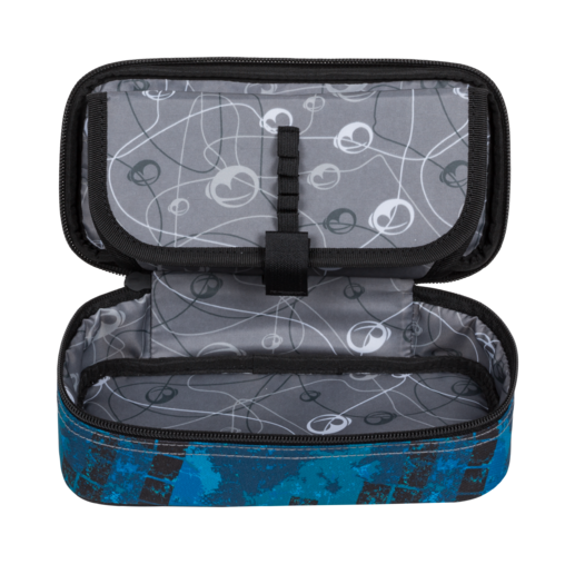 Jednokomorový studentský penál, dvojitá přepážka, spousta gumových úchytů, kapsičky uvnitř penálu.