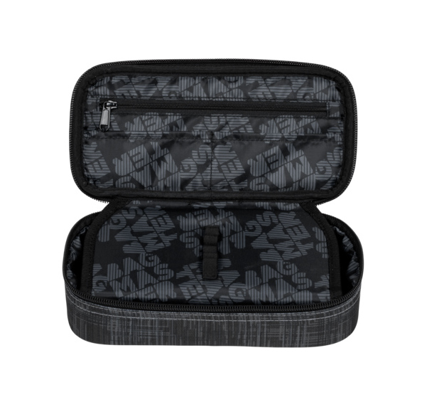 Jednokomorový studentský penál, dvojitá přepážka, spousta gumových úchytů, kapsičky uvnitř penálu.