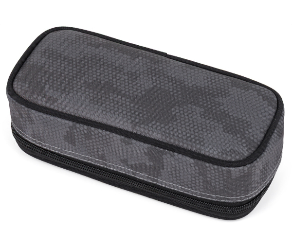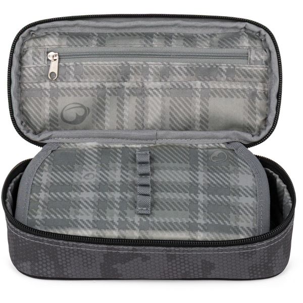 Pouzdro, etue. Na dvojité přepážce jsou gumová poutka na psací potřeby, další pomůcky se vejdou do prostoru pod přepážkou. Zapíná se pohodlně zipem s jedním taháčkem.