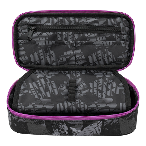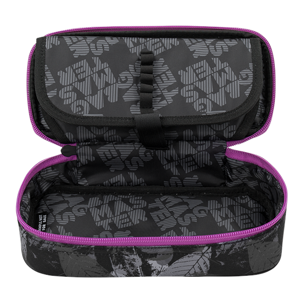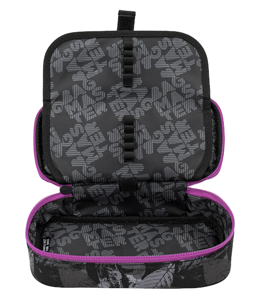 Jednokomorový studentský penál, dvojitá přepážka, spousta gumových úchytů, kapsičky uvnitř penálu.