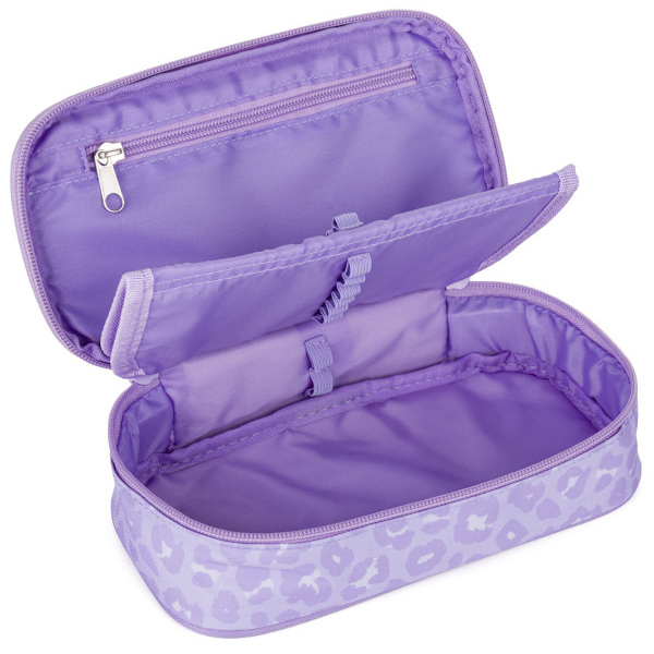 Školní pouzdro je opatřeno pevnými zipy, uzavíratelnou kapsičkou na zip, přihrádkou na pravítko a klopou s šesti poutky na psací potřeby.