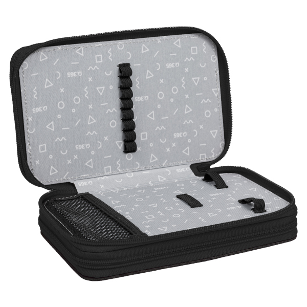 První patro obsahuje 8 gumiček na pastelky, 3 širší gumičky na ořezávátko i gumu a nově také síťovanou kapsičku s pružným lemem na uložení drobností.