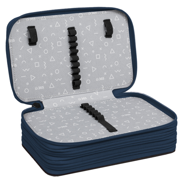 První patro obsahuje 8 gumiček na pastelky, 3 širší gumičky na ořezávátko i gumu a nově také síťovanou kapsičku s pružným lemem na uložení drobností.