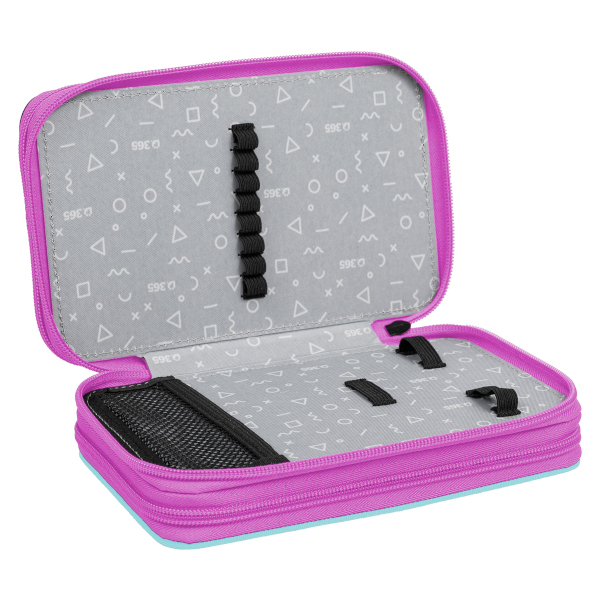 První patro obsahuje 8 gumiček na pastelky, 3 širší gumičky na ořezávátko i gumu a nově také síťovanou kapsičku s pružným lemem na uložení drobností.