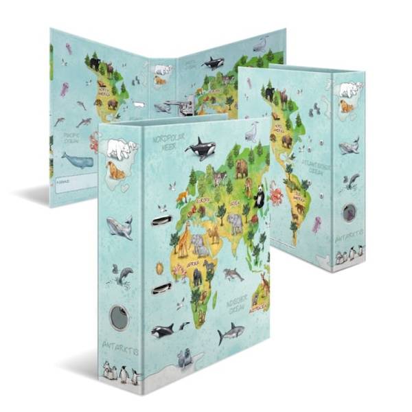 Pákový pořadač A4 s motivem - mapa, bez štítku a ochranné lišty. Hřbetní otvor pro snadnou manipulaci, uzavíratelný mechanismus, který drží pořadač vždy zavřený, potažený lesklým laminem