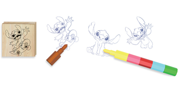 Set obsahuje 3 snadno uchopitelná dřevěná razítka, barevnou podušku s oblíbeným motivem a šestibarevnou skládací voskovku pro vybarvování.
