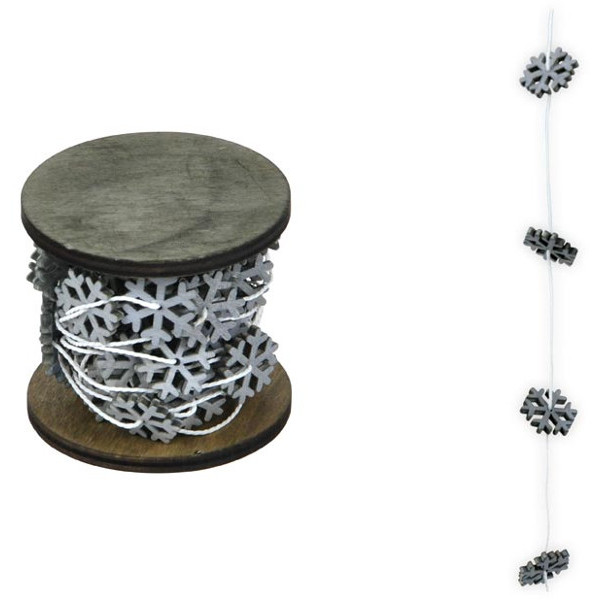 Vánoční dekorace, řetěz tvořený ze 48 ks vloček vyřezávaných z překližky. Vločky jsou navlečené na provázku a nabarveny šedostříbrnou barvou. Celý řetěz je namotaný na dřevěné špulce a zatavený do folie.