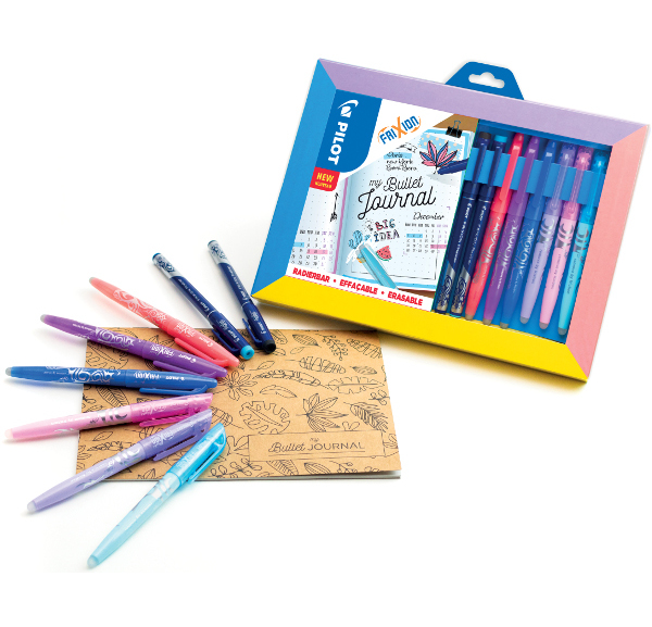 Set obsahuje: Pilot Frixion Fineliner - černá a modrá, Pilot FriXion Ball 07 - korálová, lila, nebezská modř, Pilot FriXion Light Soft - pastelová růžová, pastelová zelená, pastelová fialová, tečkovaný sešit A5 pro vytváření bullet journalu
