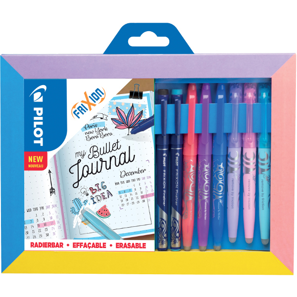 Set obsahuje: Pilot Frixion Fineliner - černá a modrá, Pilot FriXion Ball 07 - korálová, lila, nebezská modř, Pilot FriXion Light Soft - pastelová růžová, pastelová zelená, pastelová fialová, tečkovaný sešit A5 pro vytváření bullet journalu.- Výrobce:Pilot